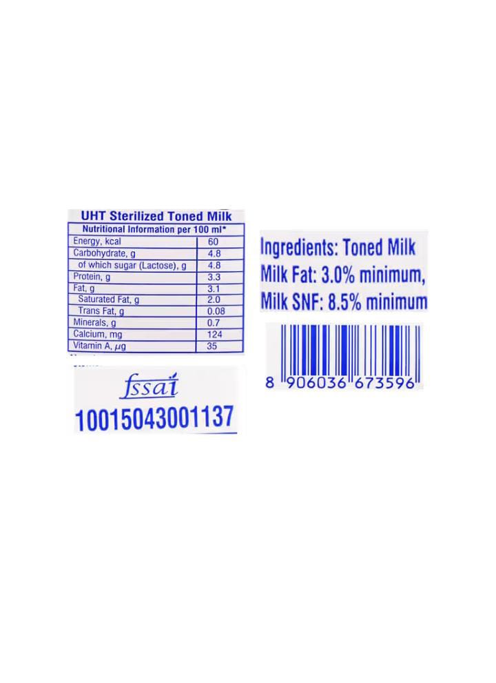 description and key characteristics: Product Description Type: Toned Milk (meaning the fat content has been standardized to a lower level than whole milk). Processing: It is UHT (Ultra High Temperature) processed and homogenized. UHT treatment sterilizes the milk, giving it a long shelf life. Homogenization ensures a smooth, uniform texture and prevents the cream from separating. Packaging: Usually sold in aseptic Tetra Pak cartons. Storage: Due to the UHT process, it generally does not require refrigeration until the pack is opened. Once opened, it should be refrigerated. Usage: Suitable for all generations and commonly used for making tea, coffee, milkshakes, smoothies, or consuming directly with cereal.