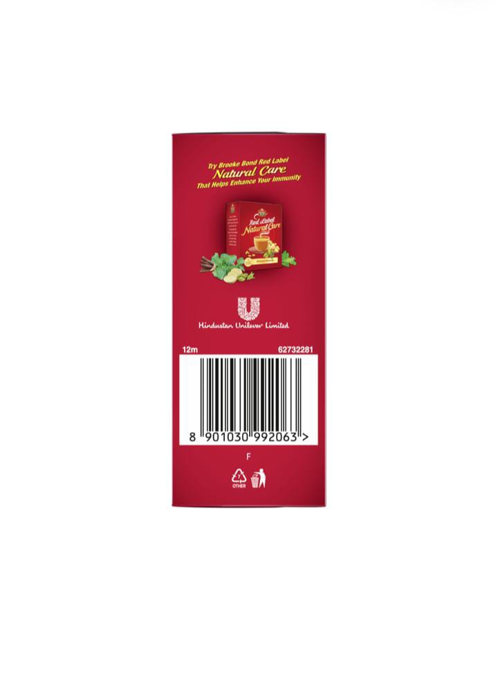 Brooke Bond Red Label Tea in the 100g size, based on common product information : Brooke Bond Red Label Tea (100g) Brooke Bond Red Label is one of India's largest-selling packaged tea brands. The 100g pack offers a blend of CTC (Crush, Tear, Curl) tea made with high-quality leaves. Key Features: Type: CTC Tea (a blend of leaves and granules). Taste Profile: Brewed to provide strength, rich color, and a refreshing taste. Heritage: Brooke Bond launched Red Label in 1903, with a history dating back to 1869. Core Philosophy: The brand is often associated with the message of "Swad Apnepan ka" (Taste of Togetherness), promoting inclusiveness and bringing people together over a cup of chai. Important Note: The 100g size is typically available for both the Red Label Core product and sometimes the Red Label Natural Care variant. Red Label Natural Care includes a mix of 5 Ayurvedic ingredients (such as Tulsi, Ashwagandha, Mulethi, Ginger, and Cardamom) and is often advertised for its clinically proven properties to enhance immunity.